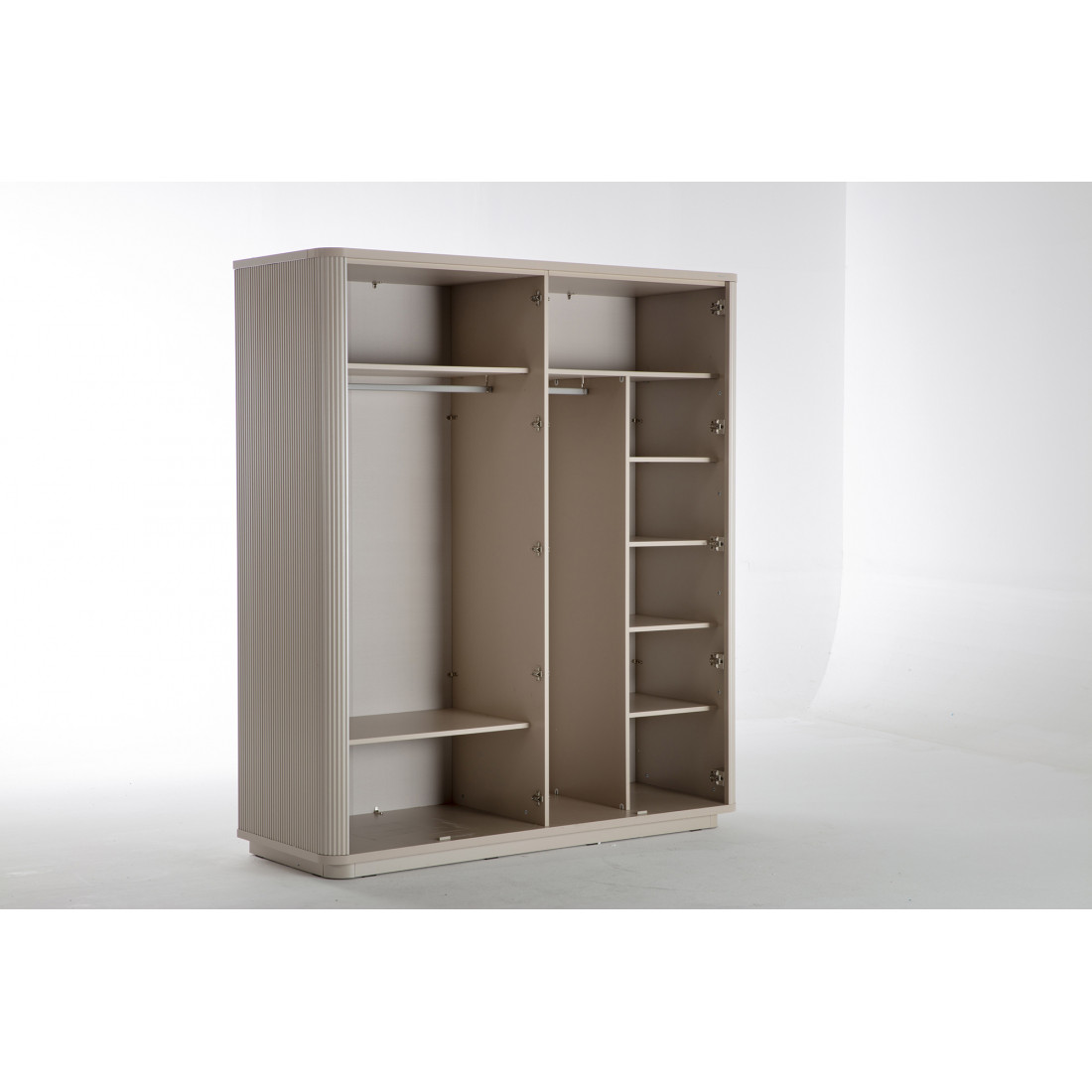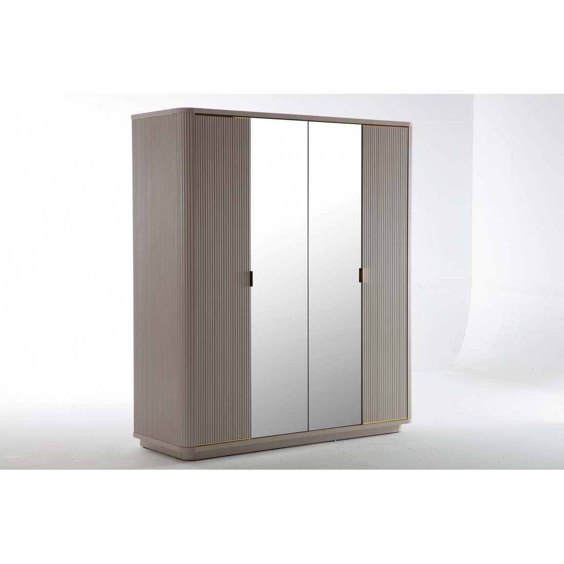 Четырехдверный шкаф Санвито SANV-20 один из  вариантов шкафов, представленных турецким брендом Bellona в коллекции SANVITO. Благодаря своей  длине 1810 мм, он отлично впишется в небольшую спальню. Наполнение же шкафа ,при глубине 660мм, позволит хранить все необходимые вещи для гардероба. В шкафу предусмотрены как полки для белья, так и штанги для вещей. Максимум хранения при минимальных габаритах. Отдельно стоит уделить внимание дизайну шкафчика. Первое, что обращает на себя внимание это округленная форма шкафа, отсутствиеострых углов. Шкафчик кажется обтекаемым со всех сторон. Вертикальные рифленые полосы на фасадах наоборот создают эффект увеличения высоты. .Центральные зеркальные фасады отлично комбинируются с теплыми кремовыми тонами боковых фасадов.