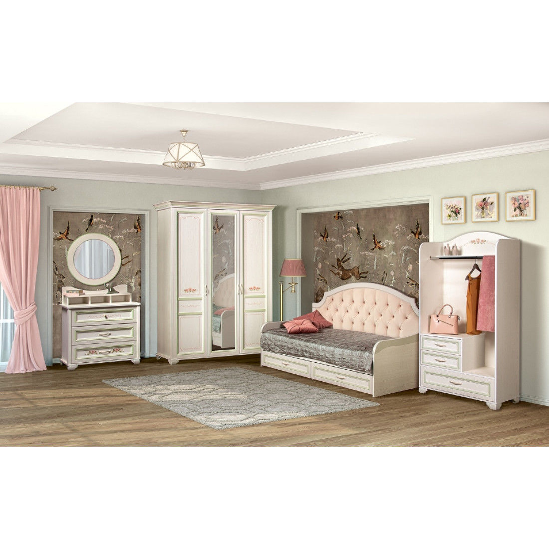 Фасады: МДФ, декоры – ясень белый, патина, рисунок, зеркало с фацетом