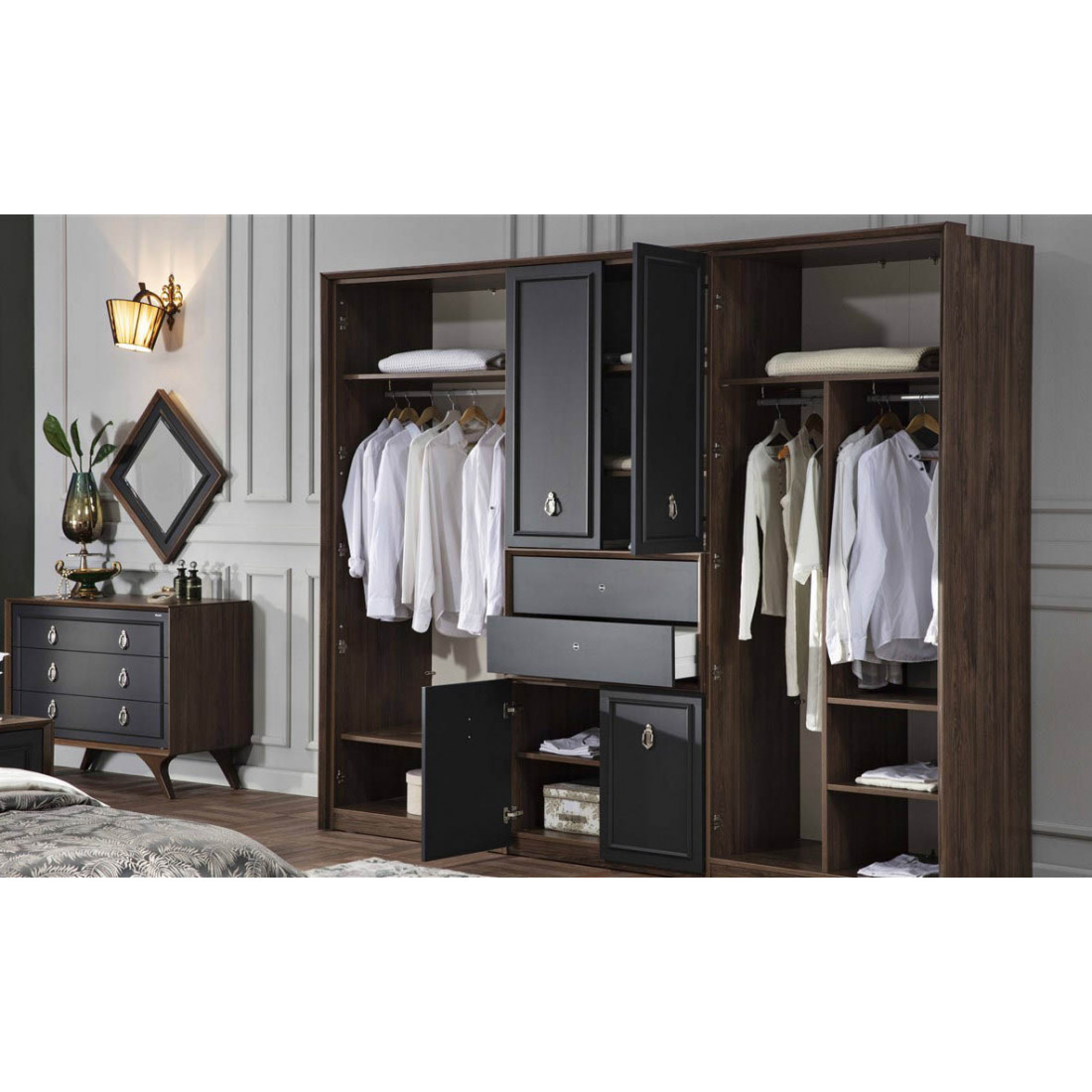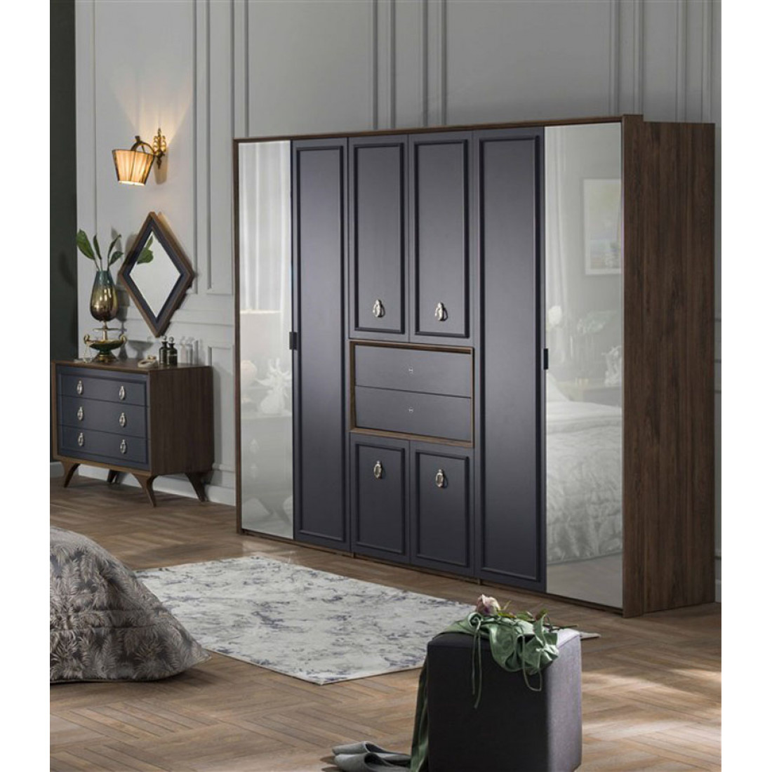 Шестистворчатый распашной шкаф для одежды и белья с зеркалом в спальню ALEG-34серии Кастелло от Беллона – потрясающе великолепное и выгодное предложение для просторных спален и гардеробных от известного турецкого производителя. Больше нет нужды выстраивать линейные композиции и переживать, насколько гармонично, целостно и эффектно они будут смотреться в интерьере – роскошное дизайнерское решение уже готово.
