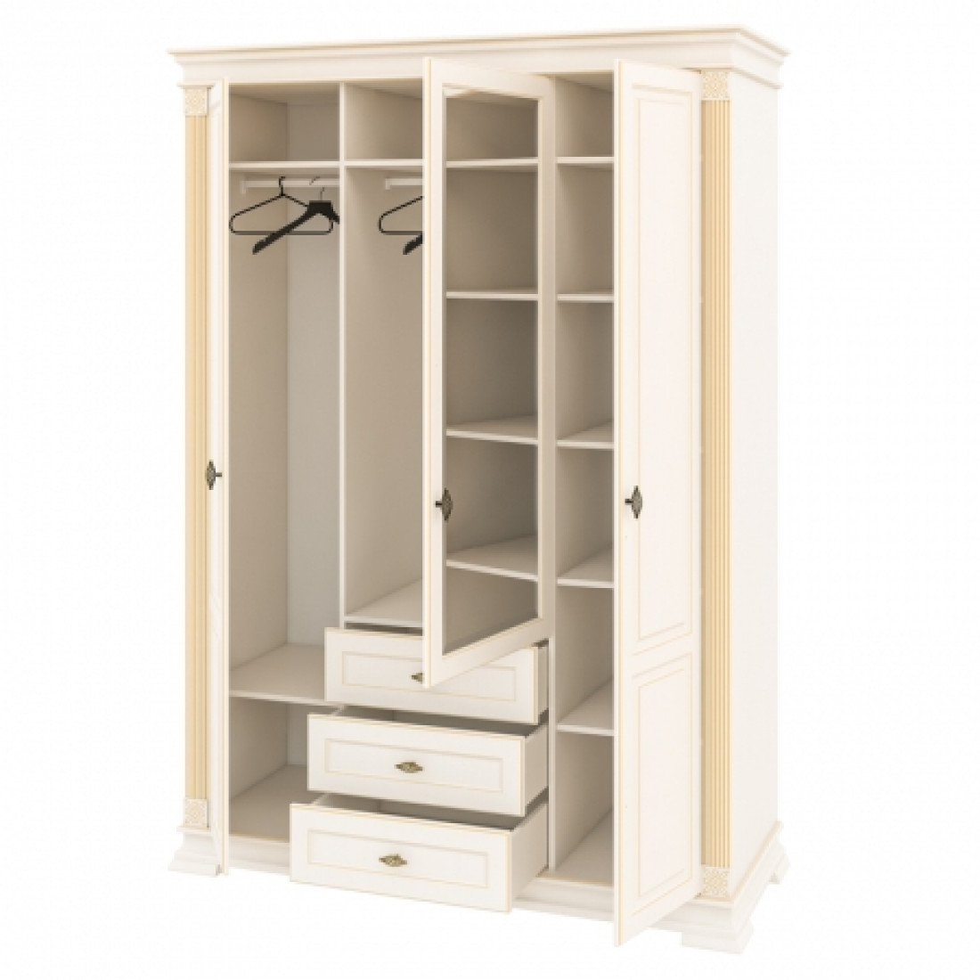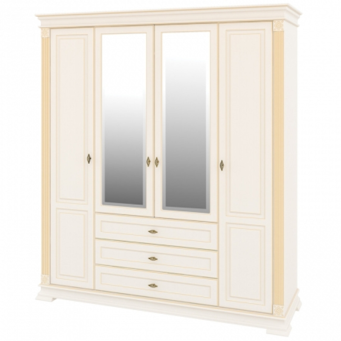 Роскошный четырехстворчатый шкаф для одежды и белья МН-222-14 в спальню новой серии Афина (Мебель-Неман) выполнен в светлом кремовом оттенке с золотой патиной, является настоящим подарком производителя. Купить шкаф можно для комплекта полного спального гарнитура Афина с другими элементами серии или отдельно.