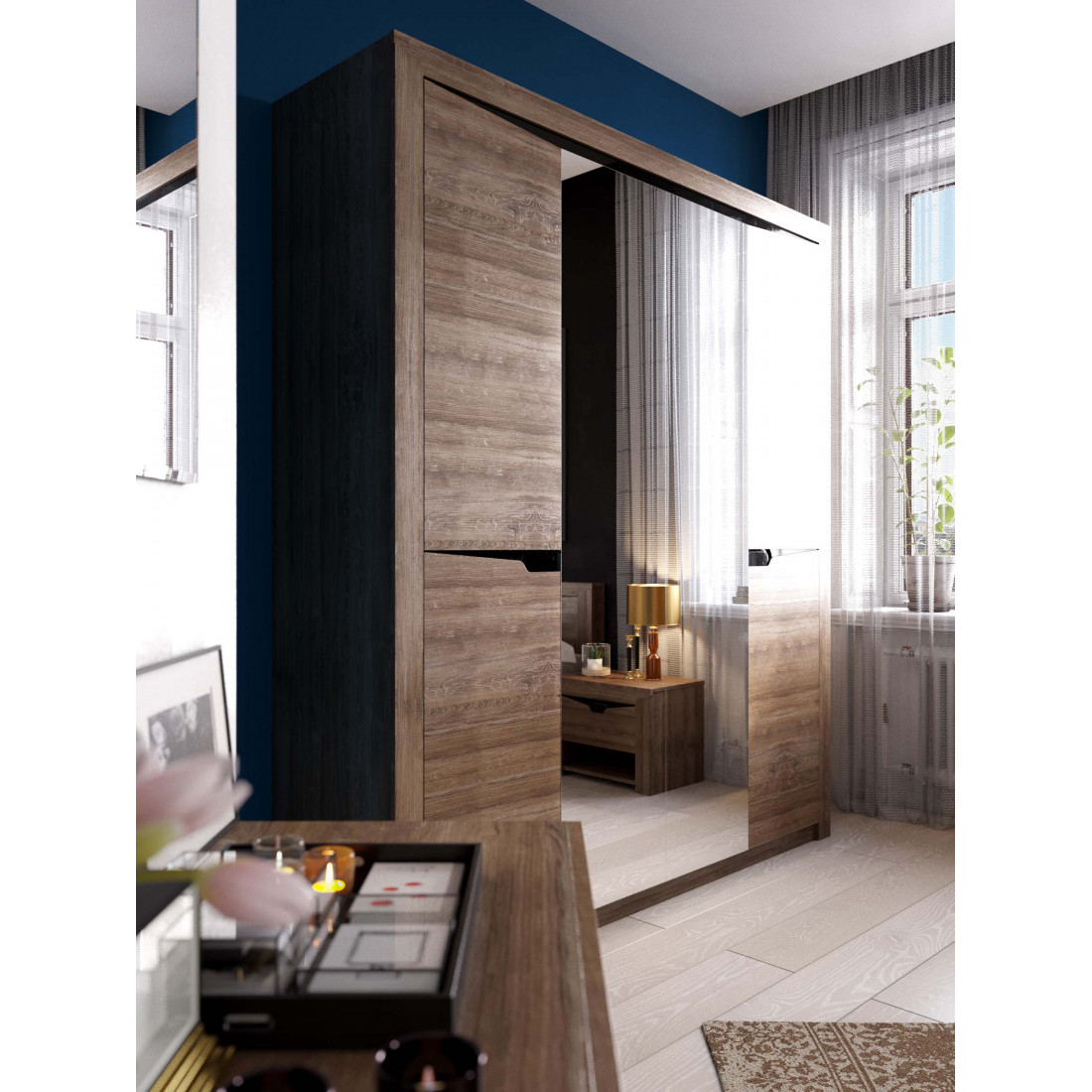 Четырехдверный шкаф для одежды из коллекции Соренто Дуб стирлинг порадует ценителей лаконичных форм своими простыми, современными линиями и приятной светлой деревянной текстурой, создающей чувство покоя и комфорта в вашем доме. Встроенное зеркало - утилитарное решение для удобного подбора гардероба, к тому же, оно визуально расширит пространство.