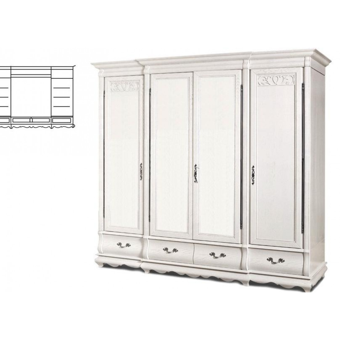 Массивный четырехдверный шкаф для спальни из коллекции "Оскар" органично впишется в интерьер в классическом стиле. Центральные двери имеют встроенные зеркала. Высокие карнизы и романтичный резной узор придают модели изящества. Выдвижные бельевые ящики на направляющих. Фасад выполнен из массива дуба, модель окрашена в оттенок "Белая эмаль с патиной".