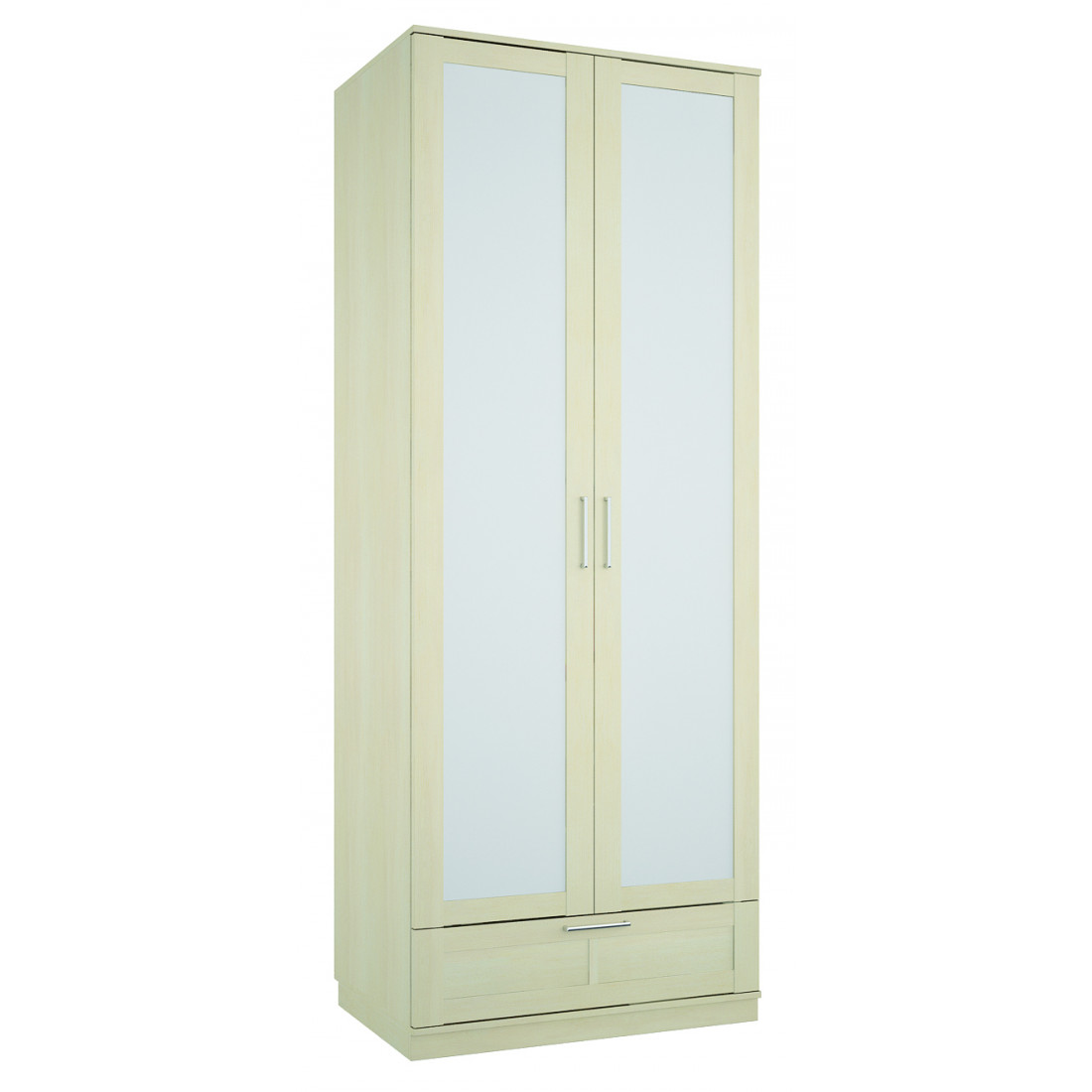 В верхнем отделении шкафа одна несъемная и одна съемная полка и штанга для одежды, в нижнем отделении выдвижной ящик на роликовых направляющих (на дно ящика макс. Нагрузка -4-5кг;