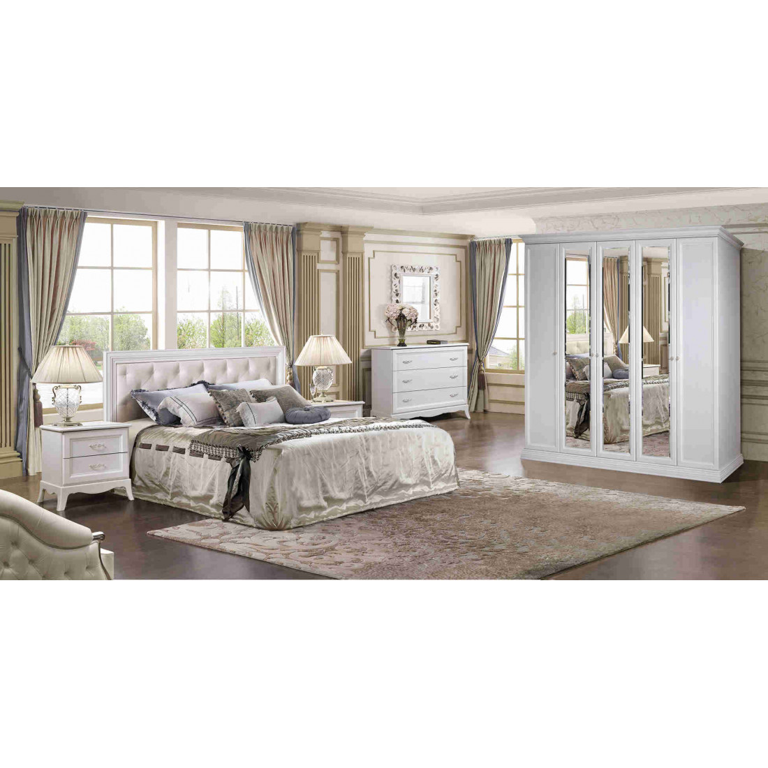 Спальня изготовлена из высококачественного ЛДСП класса Евро-1 с декором из МДФ. Ножки на тумбочках, комодах, однодверных и двухдверных шкафах сделаны из ППУ, произведенных в Италии. Двери шкафа и шуфляды комода, а также тумбочек открываются за счет бесшумных петель и направляющих фирмы «Hettich» (Германия) и «Hafele» (Германия).